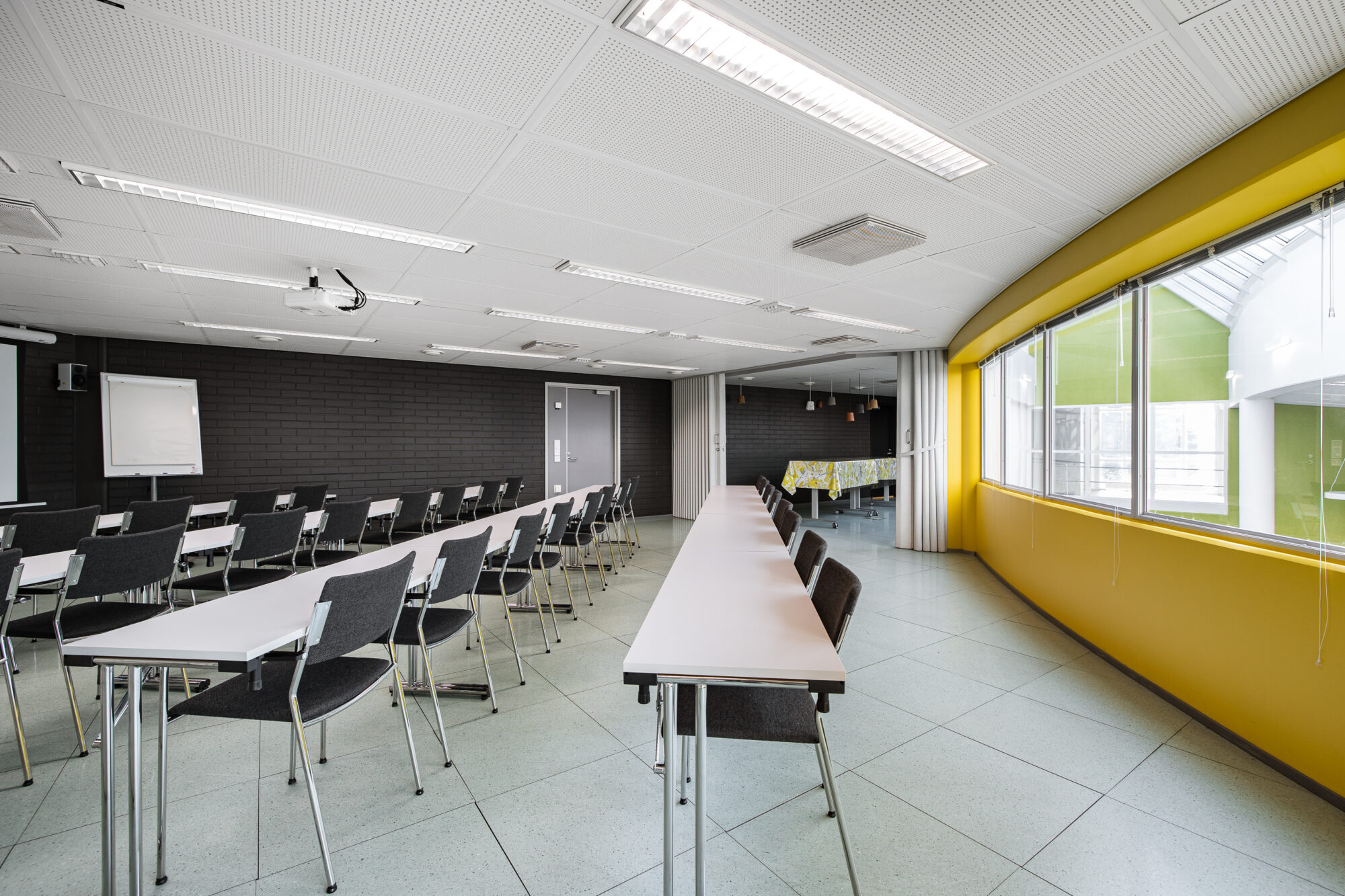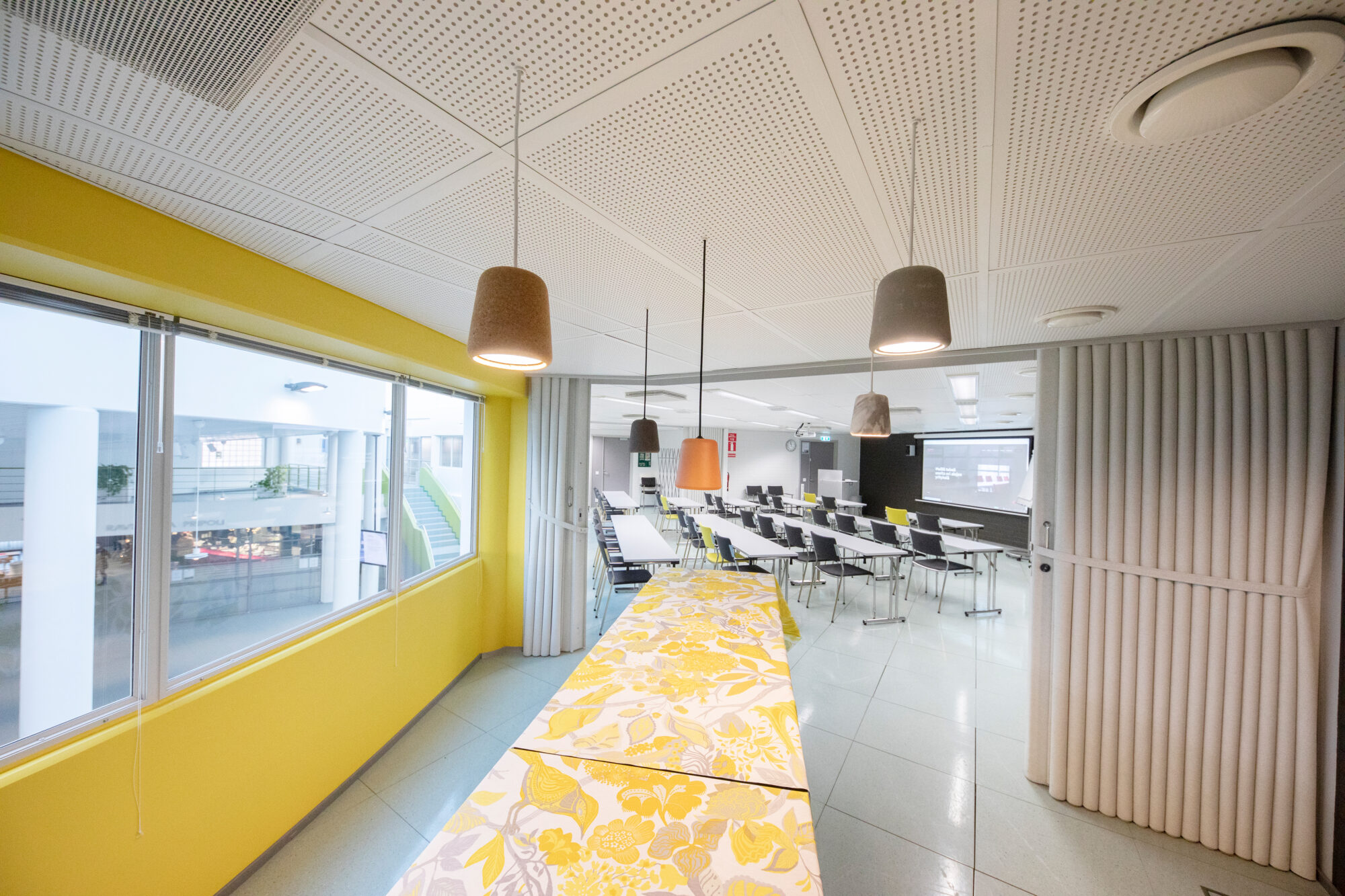Koulutus, aamupalaveri, ideariihi, kehityspäivä… Kokoustila Akseli on pirteä ja näppärä neukkari juuri silloin, kun tarvitset tilaa 5-30 henkilölle. Tilan kalustus on helposti muokattavissa luentomuodosta työpajaryhmiin tai vaikka U-muotoon ja sen valoisista sisäikkunoista avautuu näkymä 1. kerroksen Tapahtuma-aulaan. Akseli sijaitsee Pripolin K-rakennuksen 2. kerroksessa ja sinne on sujuvasti käynti myös hissillä.