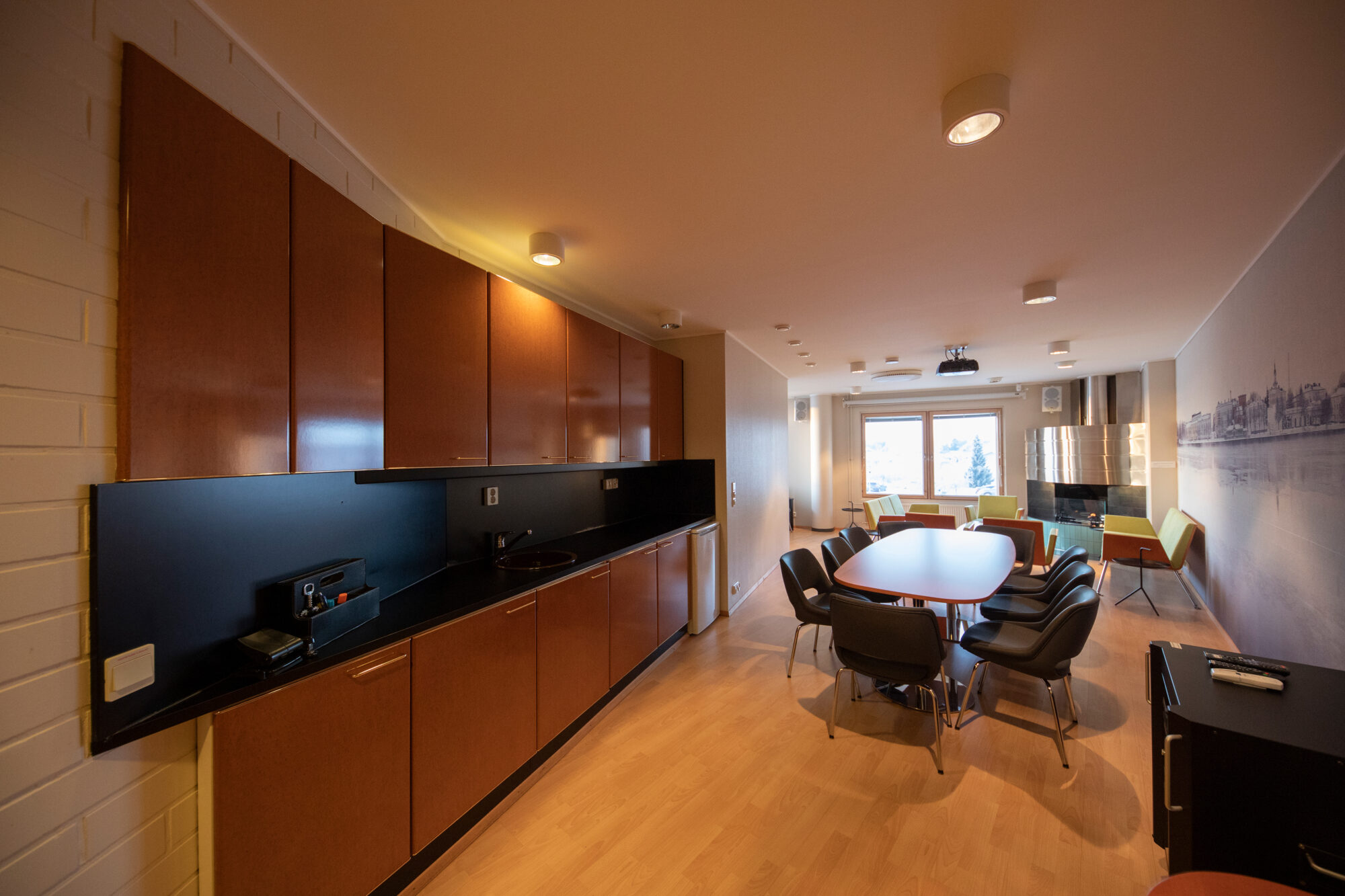 - Keittiö, jonne voi tuoda omat ruuat ja juomat, tai tilata sopivat tarjoilut Ravintola Pripolista.